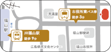 ![]() JR福山駅 徒歩10分 ビル入口にございます、エレベーターで3階にお上がりください。 ※広島銀行福山営業本部入口(エスカレーター)からは入れませんのでご注意ください。 |